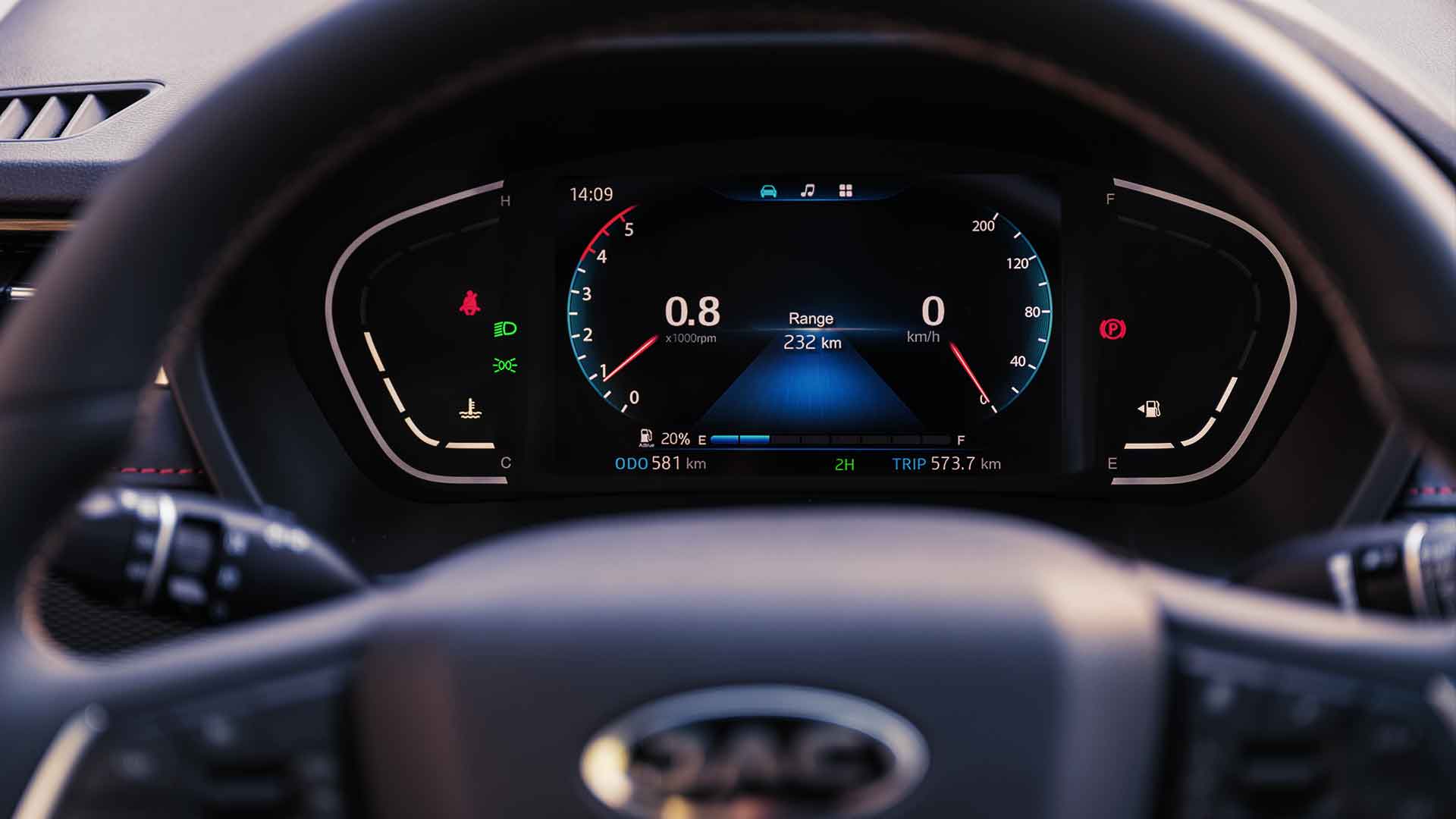 Wielofunkcyjny 7-calowy wyświetlacz dla kierowcy prezentuje kluczowe informacje w przejrzysty i nowoczesny sposób, ułatwiając kontrolę nad pojazdem podczas jazdy.